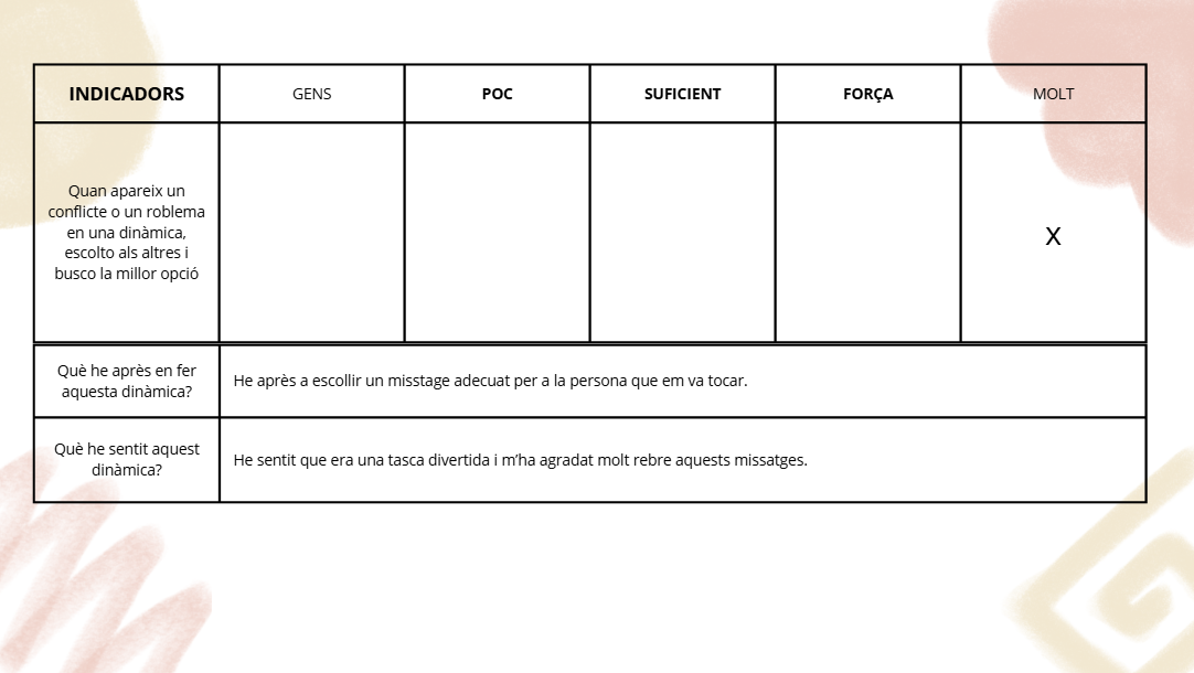 Fomentar el treball en equip: Aquesta activitat promou que els participants pensin en el benestar dels altres, comparteixin missatges positius i reconeguin la importància de la seva aportació al grup. Això afavoreix la col·laboració i pot millorar la dinàmica de treball dins d'un equip, ja sigui en un entorn escolar o professional.